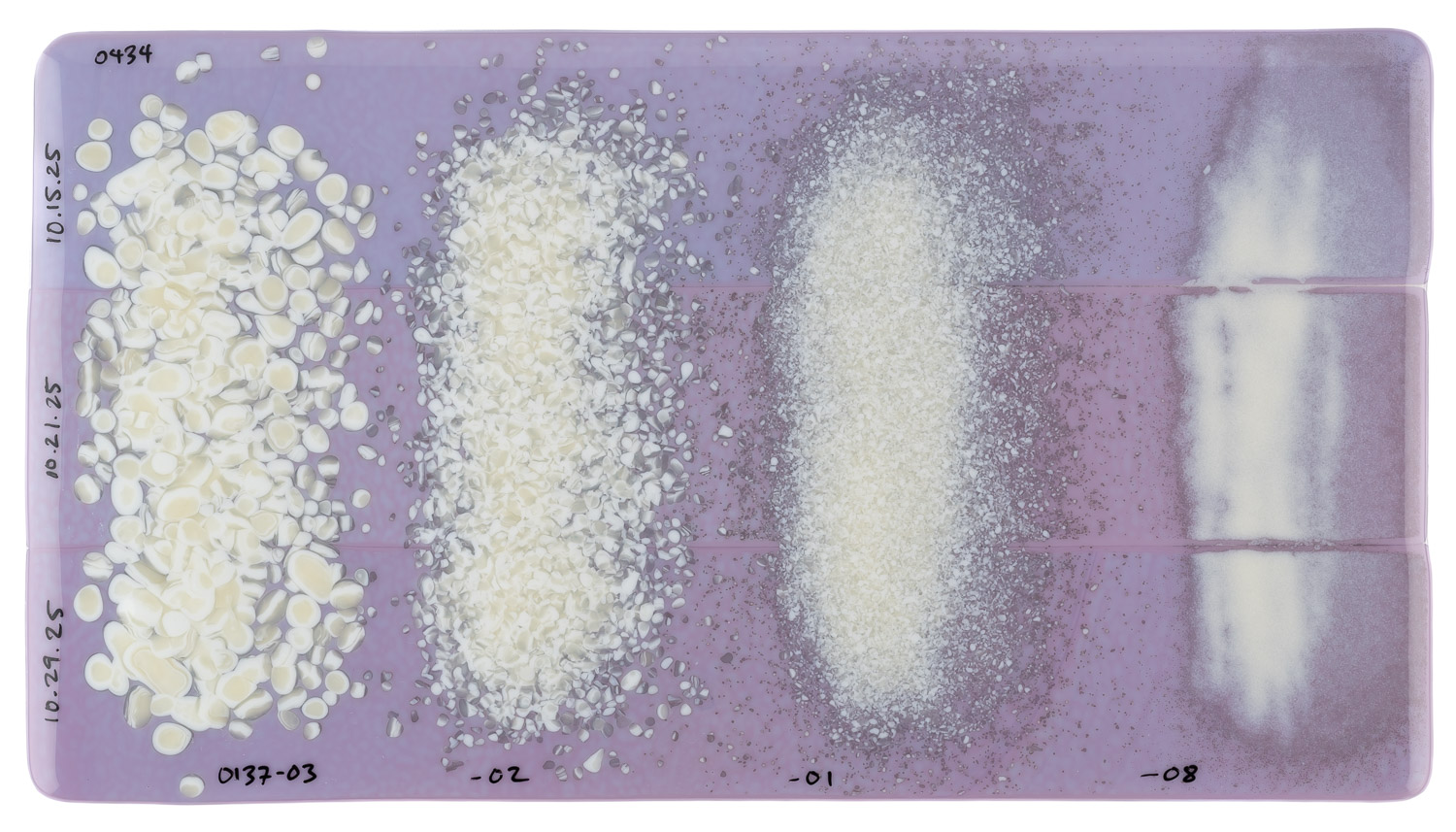 Matures to pastel purple upon firing, often with mottles and streaks remaining. Additionally, this style often fires with blue and pink hues and is not uniform in color. Underside of sheet can show patches of light and dark patterning from the forming process.