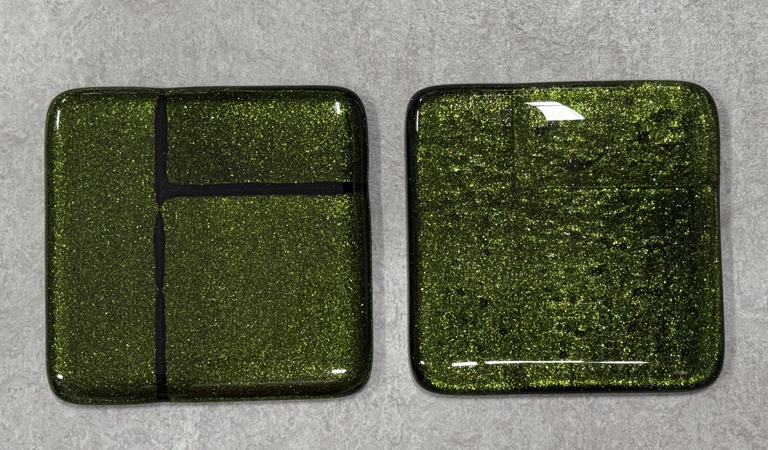 Kiln: Sparkles are more densely populated on the outer surface of the rod. Other 001412-0576 is more of a yellow-green with larger sparkles than 001112-0576. This difference is most evident in thin applications.